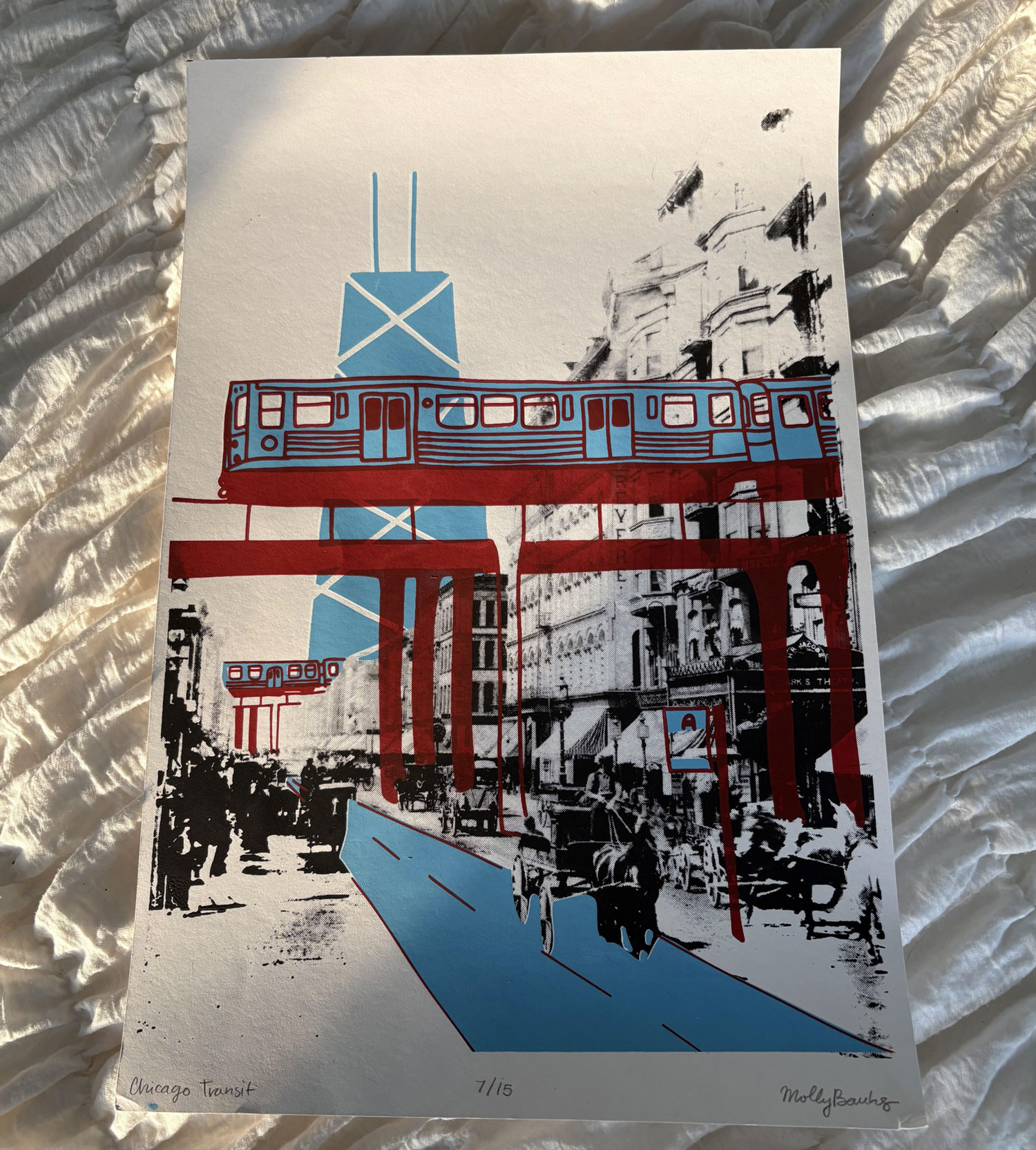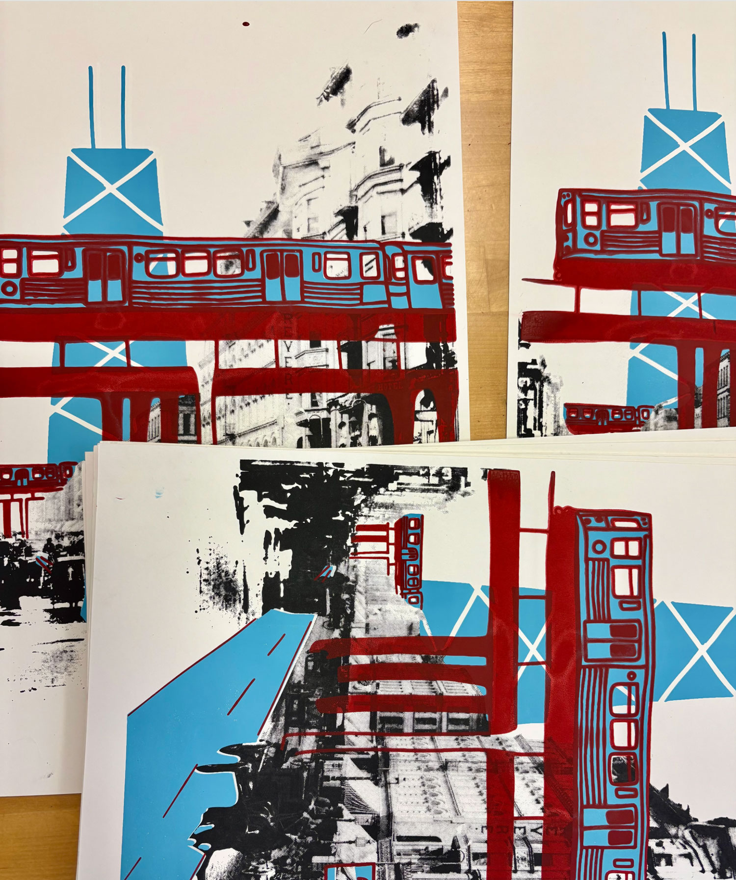 In this screenprint project, I am trying to show how Chicago has progressed from the past to now, incorporating an efficient public transit system.