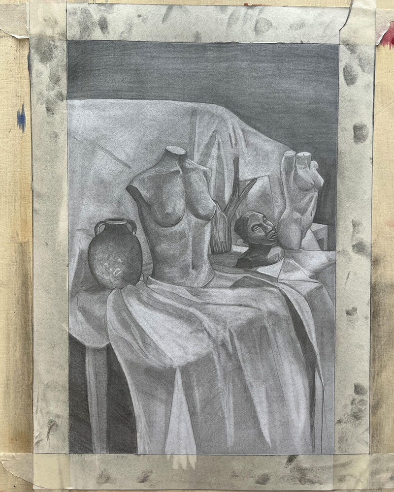 A still life scene with female busts and artifacts.
